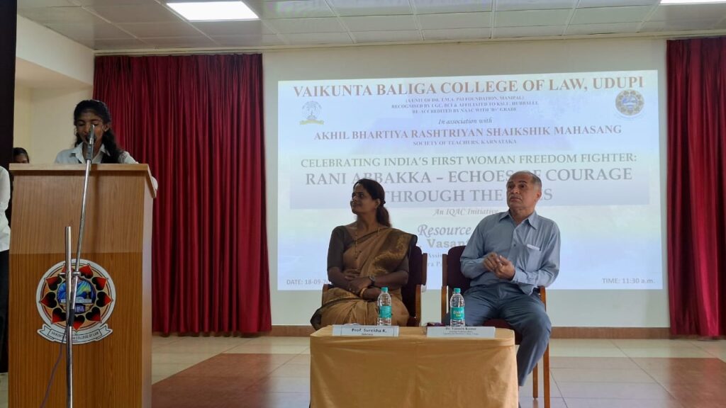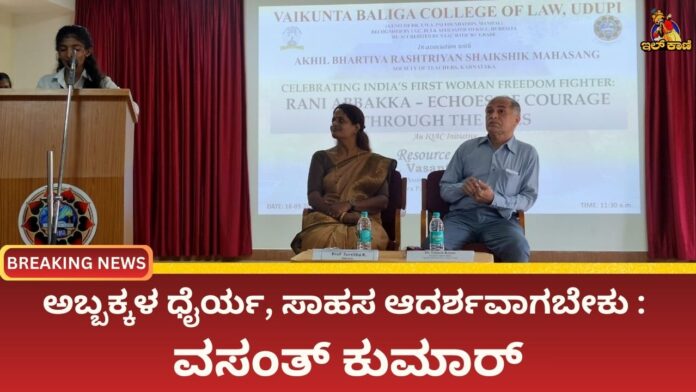ಉಡುಪಿ: ರಾಣಿ ಅಬ್ಬಕ್ಕರವರ ಬದುಕಿನ ಬಗೆಗೆ ಇಂದಿನ ಯುವಪೀಳಿಗೆ ಅರಿತು, ಅವರ ಧೈರ್ಯ, ಸಾಹಸ, ದೇಶಪ್ರೇಮವನ್ನು ತಮ್ಮೊಳಗೆ ಮೈಗೂಡಿಸಿಕೊಳ್ಳಬೇಕು ಎಂದು ಉಪೇಂದ್ರ ಪೈ ಮೆಮೋರಿಯಲ್ ಕಾಲೇಜಿನ ನಿವೃತ್ತ ಪ್ರಾಧ್ಯಾಪಕ ಡಾ| ವಸಂತ್ ಕುಮಾರ್ ಅಭಿಪ್ರಾಯಪಟ್ಟರು. ಅವರು ಗುರುವಾರ, ವೈಕುಂಠ ಬಾಳಿಗಾ ಕಾನೂನು ಮಹಾವಿದ್ಯಾಲಯ ಹಾಗೂ ಅಖಿಲ ಭಾರತೀಯ ರಾಷ್ಟ್ರೀಯ ಶೈಕ್ಷಿಕ್ ಮಹಾಸಂಘದ ಜಂಟಿ ಆಶ್ರಯದಲ್ಲಿ ನಡೆದ “ರಾಣಿ ಅಬ್ಬಕ್ಕ – ಯುಗಯುಗಗಳಿಂದ ಧೈರ್ಯದ ಪ್ರತಿಧ್ವನಿ” ಕಾರ್ಯಕ್ರಮದಲ್ಲಿ ಮಾತನಾಡಿದರು.