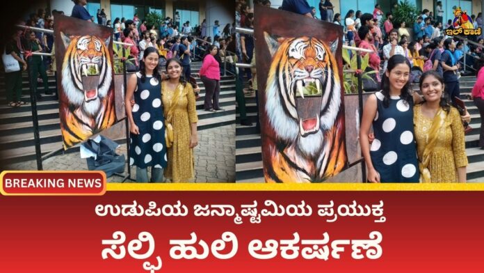 ಉಡುಪಿ : ಉಡುಪಿಯ ಜನ್ಮಾಷ್ಟಮಿಯ ಪ್ರಯುಕ್ತ ಕೆಳಪರ್ಕಳದ ಶ್ರೀ ಗೋಪಾಲಕೃಷ್ಣ ದೇವಾಲಯದಲ್ಲಿ ವಿಶೇಷವಾದ ಸೆಲ್ಫಿ ಹುಲಿ ಅಳವಡಿಸಲಾಗಿದೆ. ಮಣಿಪಾಲ ಹೆರ್ಗಾದ ಶ್ರೇಯಾ ಭಟ್ ನಿರ್ಮಿಸಿರುವ ಈ ಸೆಲ್ಫಿ ಹುಲಿ ಸದ್ಯ ಶ್ರೀಕೃಷ್ಣ ಜನ್ಮಾಷ್ಟಮಿಯ ಫೆವರೇಟ್ ಸೆಲ್ಫು ಸ್ಪಾಟ್ ಆಗಿ ಮಾರ್ಪಟ್ಟಿದೆ.