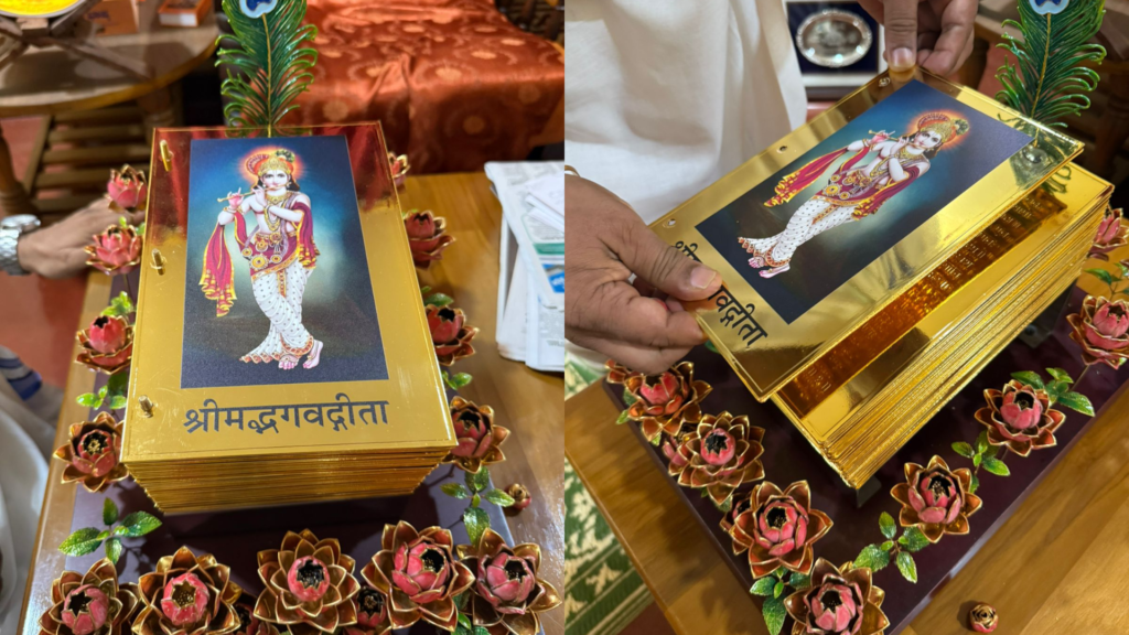 ಭಗವದ್ಗೀತೆಯ 18 ಅಧ್ಯಾಯಗಳಲ್ಲಿನ 700 ಶ್ಲೋಕಗಳನ್ನು ಚಿನ್ನದ ಹಾಳೆಯಲ್ಲಿ ಅಂದವಾಗಿ ಮುದ್ರಿಸಲಾಗಿದ್ದು, ವಿಶ್ವಗೀತಾ ಪರ್ಯಾಯ ಸಮಾರೋಪದ ಸಂದರ್ಭದಲ್ಲಿ ವಿಶೇಷ ಕಾರ್ಯಕ್ರಮದೊಂದಿಗೆ ಅರ್ಪಣೆ ನಡೆಯಲಿದೆ.