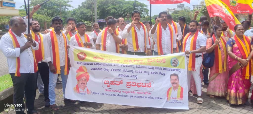 ಉಡುಪಿ: ಕೇಂದ್ರ ಸರಕಾರದ ಒತ್ತಾಯ ಪೂರ್ವಕ ಹಿಂದಿ ಹೇರಿಕೆ ವಿರೋಧಿಸಿ ಹಾಗೂ ಕರವೇ ಕಾರ್ಯಕರ್ತರನ್ನು ಬಂಧಿಸಿರುವ ರಾಜ್ಯ ಸರಕಾರದ ನಡೆಯನ್ನು ಖಂಡಿಸಿ ಕರ್ನಾಟಕ ರಕ್ಷಣಾ ವೇದಿಕೆಯ (ನಾರಾಯಣ ಗೌಡ ಬಣ) ಉಡುಪಿ ಜಿಲ್ಲಾ ಘಟಕದ ನೇತೃತ್ವದಲ್ಲಿ ಮಣಿಪಾಲದ ರಜತಾದ್ರಿಯ ಜಿಲ್ಲಾಧಿಕಾರಿ ಕಚೇರಿ ಮುಂಭಾಗದಲ್ಲಿ ಇಂದು ಪ್ರತಿಭಟನೆ ನಡೆಸಲಾಯಿತು.