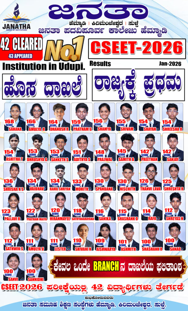 ಉಡುಪಿ : ಇನ್ಸ್ಟಿಟ್ಯೂಟ್ ಆಫ್ ಕಂಪನಿ ಸೆಕ್ರೆಟರಿಸ್ ಆಫ್ ಇಂಡಿಯಾ ನಡೆಸಿದ ಸಿ.ಎಸ್.ಇ.ಇ.ಟಿ (ಕಂಪನಿ ಸೆಕ್ರೆಟರಿ ಎಕ್ಸಿಕ್ಯೂಟಿವ್ ಎಂಟ್ರನ್ಸ್ ಟೆಸ್ಟ್ – ಜನವರಿ 2026) ಪರೀಕ್ಷೆಯಲ್ಲಿ ಜನತಾ ಪದವಿಪೂರ್ವ ಕಾಲೇಜು, ಹೆಮ್ಮಾಡಿಯ ವಾಣಿಜ್ಯ ವಿಭಾಗ ರಾಜ್ಯಮಟ್ಟದಲ್ಲಿ ಗಮನಾರ್ಹ ಸಾಧನೆ ಮಾಡಿದೆ. ಪರೀಕ್ಷೆಗೆ ಹಾಜರಾದ 43 ವಿದ್ಯಾರ್ಥಿಗಳ ಪೈಕಿ 42 ವಿದ್ಯಾರ್ಥಿಗಳು ಅತ್ಯಧಿಕ ಅಂಕಗಳೊಂದಿಗೆ ಉತ್ತೀರ್ಣರಾಗಿ ಸಿ.ಎಸ್. ಎಕ್ಸಿಕ್ಯೂಟಿವ್ ಪ್ರೋಗ್ರಾಂಗೆ ಅರ್ಹತೆ ಪಡೆದಿದ್ದಾರೆ. ಈ ಮೂಲಕ ಕಾಲೇಜು ರಾಜ್ಯದಲ್ಲೇ ಪ್ರಥಮ ಸ್ಥಾನ ಗಳಿಸಿದೆ.
