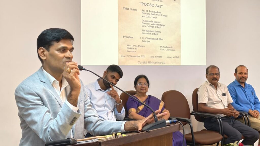 ವೈಕುಂಠ ಬಾಳಿಗಾ ಕಾನೂನು ಮಹಾವಿದ್ಯಾಲಯದ ನಿರ್ದೇಶಕಿ ಪ್ರೋ.ಡಾ.ನಿರ್ಮಲಾ ಕುಮಾರಿ ಮಾತನಾಡಿ, ಭಾರತದ ಸಂವಿಧಾನ 15 ನೇ ಅನುಚ್ಛೇದವು ಯಾರನ್ನು ತಾರತಮ್ಯ ಮಾಡಬಾರದು ಎಂದು ಹೇಳುವುದಲ್ಲದೇ, ಶೋಷಣೆಯನ್ನು ತಡೆಗಟ್ಟಲು ವಿಶೇಷ ಕಾಯ್ದೆಯನ್ನು ರಚಿಸಲು ಅವಕಾಶವನ್ನು ಕಲ್ಪಿಸಿದೆ. ಹೀಗಾಗಿ ಪೋಕ್ಸೊ ಕಾಯ್ದೆ ಸೇರಿದಂತೆ ವಿವಿಧ ಕಾಯ್ದೆಗಳನ್ನು ಜಾರಿಗೆ ತರಲಾಗಿದೆ ಎಂದರು. ಕಾಲೇಜಿನ ಪ್ರಾಂಶುಪಾಲ ಡಾ. ಚಂದ್ರಕಾಂತ್ ಭಟ್ ಅಧ್ಯಕ್ಷತೆ ವಹಿಸಿದ್ದರು. ಐಕ್ಯೂಎಸಿ ಸಂಯೋಜಕ ಡಾ.ರಾಘವೇಂದ್ರ, ಪೋಶ್ ಸೆಲ್ ಸಂಯೋಜಕಿ ಲವಿಟಾ ಡಿ’ಸೋಜಾ ಉಪಸ್ಥಿತರಿದ್ದರು.