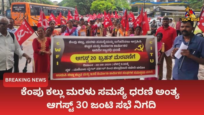 ಉಡುಪಿ: ಕಟ್ಟಡ ಕಾರ್ಮಿಕರಿಗೆ ಕೆಂಪು ಕಲ್ಲು ಮರಳು ಸಮಸ್ಯೆ ಬಗೆಹರಿಸಲು ಆಗ್ರಹಿಸಿ ಆಗಸ್ಟ್ 18 ರಿಂದ ನಡೆಯುತ್ತಿರುವ ಅನಿರ್ಧಿಷ್ಟಾವಧಿ ಧರಣಿ ಸತ್ಯಾಗ್ರಹ ಹಿನ್ನಲೆ ಇಂದು ಜಿಲ್ಲೆಯ ಸಾವಿರಾರು ಕಟ್ಟಡ ನಿರ್ಮಾಣ ಕಾರ್ಮಿಕರು ಮಣಿಪಾಲ ಟೈಗರ್ ಸರ್ಕಲ್ ಬಳಿಯಿಂದ ಬ್ರಹತ್ ಮೆರವಣಿಗೆ ನಡೆಸಿದ ಕಾರ್ಮಿಕರು ಜಿಲ್ಲಾಧಿಕಾರಿ ಕಚೇರಿಗೆ ಚಲೋ ನಡೆಸಿ ಪ್ರತಿಭಟಿಸಿದರು. ಜಿಲ್ಲಾಧಿಕಾರಿ ಕಚೇರಿ ಎದುರು ಮೆರವಣಿಗೆ ಬರುತ್ತಿದ್ದಂತೆ ಜಿಲ್ಲಾಧಿಕಾರಿ ಕಚೇರಿ ಎರಡೂ ಗೇಟ್ ಗಳನ್ನು ಬಂದ್ ಮಾಡಲಾಗಿತ್ತು.