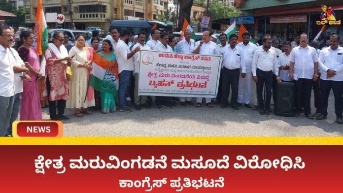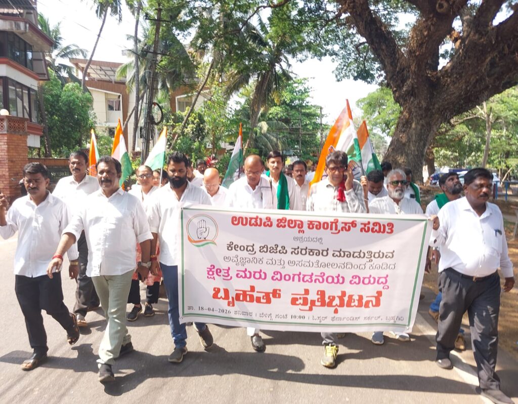ಉಡುಪಿ: ಕೇಂದ್ರ ಸರ್ಕಾರದ ಕ್ಷೇತ್ರ ಮರುವಿಂಗಡನೆ ಮಸೂದೆ ವಿರುದ್ಧ ಜಿಲ್ಲಾ ಕಾಂಗ್ರೆಸ್ ವತಿಯಿಂದ ಶುಕ್ರವಾರ ಪ್ರತಿಭಟನೆ ನಡೆಯಿತು. ಉಡುಪಿ ಜಿಲ್ಲಾ ಕಾಂಗ್ರೆಸ್ ಭವನದಿಂದ ಕಾಲ್ನಡಿಗೆ ಮೂಲಕ ಬ್ರಹ್ಮಗಿರಿ ಸರ್ಕಲ್ಗೆ ಆಗಮಿಸಿದ ಕಾರ್ಯಕರ್ತರು, ಅಲ್ಲಿ ಕೆಲಕಾಲ ರಸ್ತೆ ತಡೆ ನಡೆಸಿ ಆಕ್ರೋಶ ವ್ಯಕ್ತಪಡಿಸಿದರು.