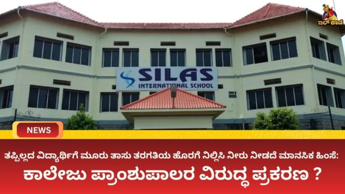 ಉಡುಪಿ: ತಪ್ಪೇ ಮಾಡದ ವಿದ್ಯಾರ್ಥಿಯನ್ನು ಮೂರು ತಾಸುಗಳ ಕಾಲ ತರಗತಿಯ ಹೊರಗಡೆ ನಿಲ್ಲಿಸಿ, ನೀರು ಕೂಡ ನೀಡದೆ ಮಾನಸಿಕವಾಗಿ ಹಿಂಸೆ ನೀಡಿದ ಆರೋಪದಡಿ ಉಡುಪಿಯ ನಿಟ್ಟೂರಿನ ಸಿಲಾಸ್ ಪದವಿ ಪೂರ್ವ ಕಾಲೇಜಿನ ಪ್ರಾಂಶುಪಾಲರ ವಿರುದ್ಧ ಉಡುಪಿ ನಗರ ಪೊಲೀಸ್ ಠಾಣೆಯಲ್ಲಿ ಪ್ರಕರಣ ದಾಖಲಾಗಿದೆ. ನ. 3ರಂದು ಕಾಲೇಜಿನ ತರಗತಿಯಲ್ಲಿ ಪಾಠ ನಡೆಯುತ್ತಿದ್ದ ವೇಳೆ ಕೆಲ ವಿದ್ಯಾರ್ಥಿಗಳು ಸಿಡಿಮದ್ದನ್ನು ಸಿಡಿಸಿದ್ದರೆಂದು ಆರೋಪಿಸಲಾಗಿದೆ.
