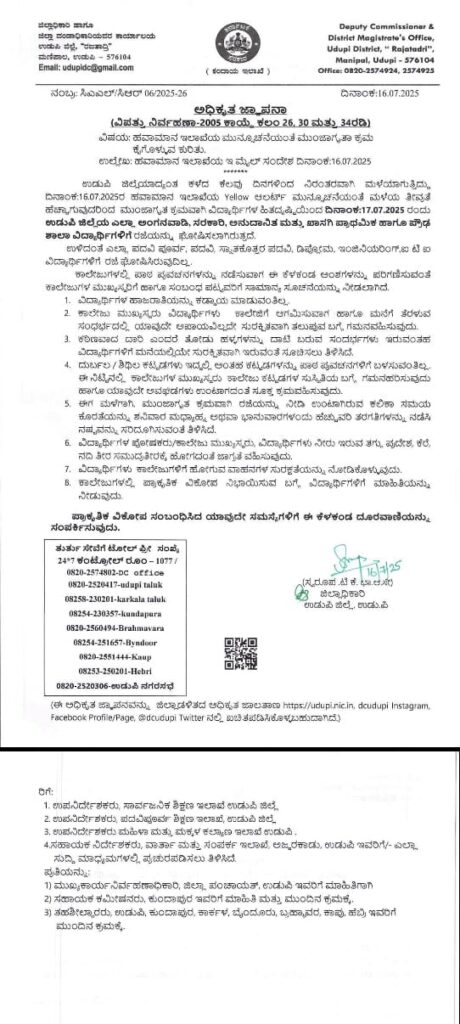 ಮಳೆಯ ತೀವ್ರತೆ ಹೆಚ್ಚಾಗಿರುವ ಹಿನ್ನಲೆ ಮುಂಜಾಗ್ರತಾ ಕ್ರಮವಾಗಿ ಜಿಲ್ಲೆಯ ಅಂಗನವಾಡಿ, ಸರಕಾರಿ, ಅನುದಾನಿತ ಮತ್ತು ಖಾಸಗಿ ಪ್ರಾಥಮಿಕ ಹಾಗೂ ಪ್ರೌಢಶಾಲಾ ವಿದ್ಯಾರ್ಥಿಗಳಿಗೆ ರಜೆ ಘೋಷಿಸಲಾಗಿದೆ. ಉಳಿದಂತೆ ಪದವಿ ಪೂರ್ವ, ಪದವಿ, ಸ್ನಾತಕೋತ್ತರ ಪದವಿ, ಡಿಫ್ಲೋಮ, ಇಂಜಿನಿಯರಿಂಗ್, ಐಟಿಐ ವಿದ್ಯಾರ್ಥಿಗಳಿಗೆ ರಜೆ ಘೋಷಣೆಯಾಗಿಲ್ಲ.