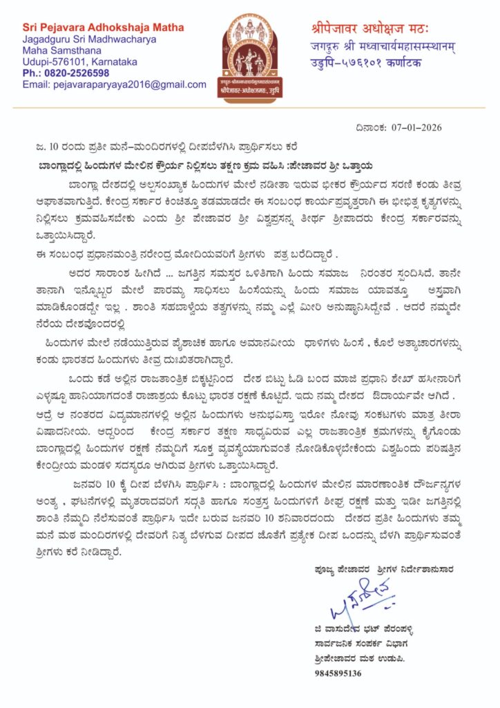 ಬಾಂಗ್ಲಾದೇಶದಲ್ಲಿ ಹಿಂದುಗಳ ಮೇಲೆ ನಡೆಯುತ್ತಿರುವ ಮಾರಣಾಂತಿಕ ದೌರ್ಜನ್ಯಗಳ ಅಂತ್ಯ, ಘಟನೆಯಲ್ಲಿ ಮೃತರಾದವರಿಗೆ ಸದ್ಗತಿ ಮತ್ತು ಸಂತ್ರಸ್ತರಿಗೆ ಶೀಘ್ರ ರಕ್ಷಣೆ ದೊರಕುವಂತೆ, ಜೊತೆಗೆ ಇಡೀ ಜಗತ್ತಿನಲ್ಲಿ ಶಾಂತಿ–ನೆಮ್ಮದಿ ನೆಲೆಸುವಂತೆ ಪ್ರಾರ್ಥಿಸಲು ಜನವರಿ 10 (ಶನಿವಾರ)ರಂದು ದೇಶದ ಪ್ರತಿಯೊಬ್ಬ ಹಿಂದು ತಮ್ಮ ಮನೆ, ಮಠ, ಮಂದಿರಗಳಲ್ಲಿ ನಿತ್ಯದ ದೀಪದೊಂದಿಗೆ ಹೆಚ್ಚುವರಿ ದೀಪವೊಂದನ್ನು ಬೆಳಗಿಸಬೇಕೆಂದು ಶ್ರೀಗಳು ಕರೆ ನೀಡಿದ್ದಾರೆ.
