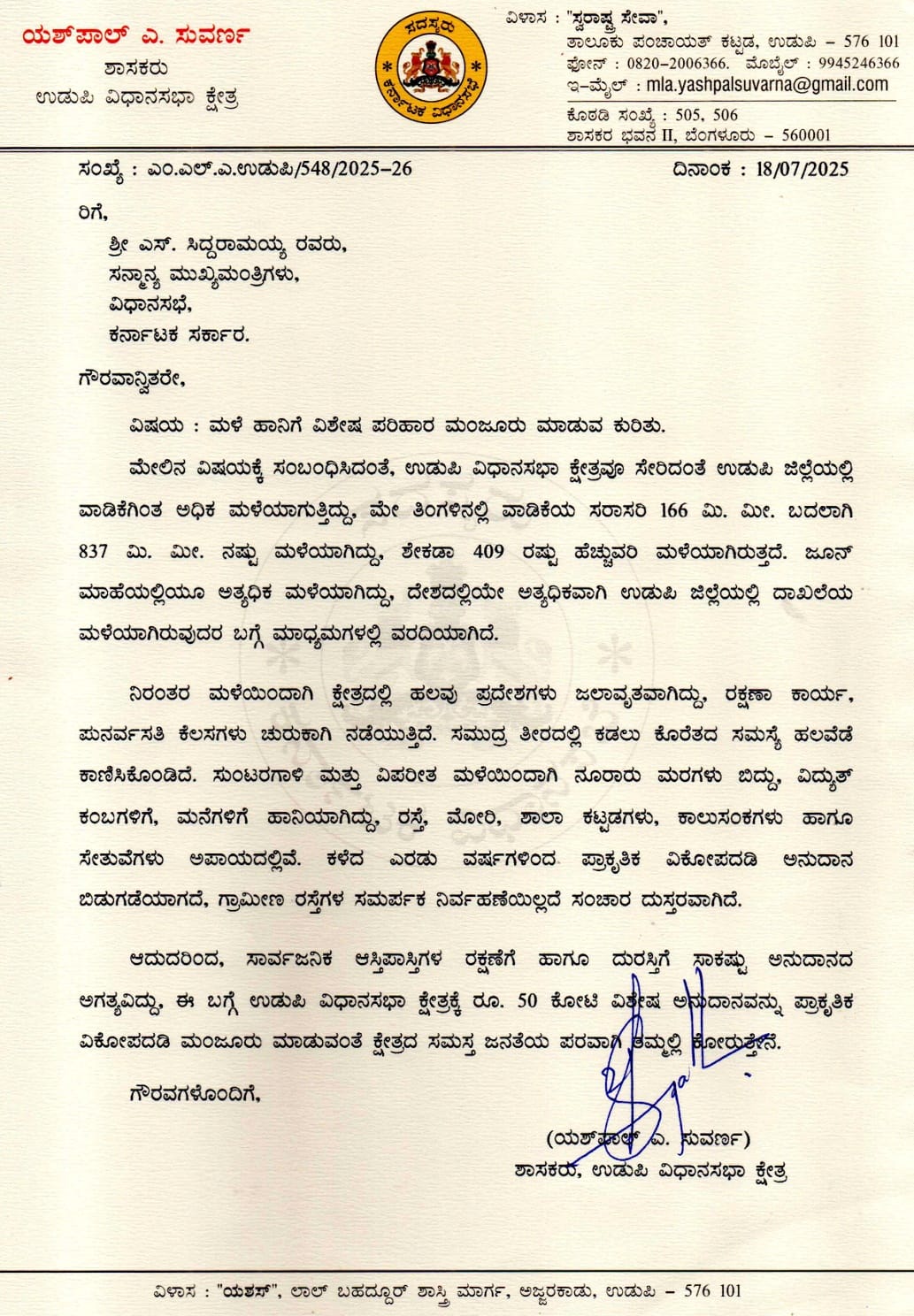 ಉಡುಪಿ : ಉಡುಪಿ ವಿಧಾನಸಭಾ ಕ್ಷೇತ್ರವೂ ಸೇರಿದಂತೆ ಉಡುಪಿ ಜಿಲ್ಲೆಯಲ್ಲಿ ವಾಡಿಕೆಗಿಂತ ಅಧಿಕ ಮಳೆಯಾಗುತ್ತಿದ್ದು, ಉಡುಪಿ ವಿಧಾನಸಭಾ ಕ್ಷೇತ್ರದ ಮಳೆ ಹಾನಿ ಸಂಬಂಧಿತ ಕಾಮಗಾರಿಗಳಿಗೆ ₹ 50 ಕೋಟಿ ವಿಶೇಷ ಅನುದಾನವನ್ನು ಮಂಜೂರು ಮಾಡುವಂತೆ ಉಡುಪಿ ಶಾಸಕ ಯಶ್ ಪಾಲ್ ಸುವರ್ಣ ಮುಖ್ಯಮಂತ್ರಿಗಳಿಗೆ ಪತ್ರ ಬರೆದು ಮನವಿ ಮಾಡಿದ್ದಾರೆ. ಉಡುಪಿ ಜಿಲ್ಲೆಯಲ್ಲಿ ಮೇ ತಿಂಗಳಿನಲ್ಲಿ ವಾಡಿಕೆಯ ಸರಾಸರಿ 166 ಮಿ. ಮೀ. ಬದಲಾಗಿ 837 ಮಿ. ಮೀ. ನಷ್ಟು ಮಳೆಯಾಗಿದ್ದು, ಶೇಕಡಾ 409 ರಷ್ಟು ಹೆಚ್ಚುವರಿ ಮಳೆಯಾಗಿದೆ. ಜೂನ್ ತಿಂಗಳಿನಲ್ಲಿಯೂ ಅತ್ಯಧಿಕ ಮಳೆಯಾಗಿದ್ದು, ದೇಶದಲ್ಲಿಯೇ ಅತ್ಯಧಿಕವಾಗಿ ಉಡುಪಿ ಜಿಲ್ಲೆಯಲ್ಲಿ ದಾಖಲೆಯ ಮಳೆಯಾಗಿರುವುದರ ಬಗ್ಗೆ ಮಾಧ್ಯಮಗಳಲ್ಲಿ ವರದಿಯಾಗಿದೆ.