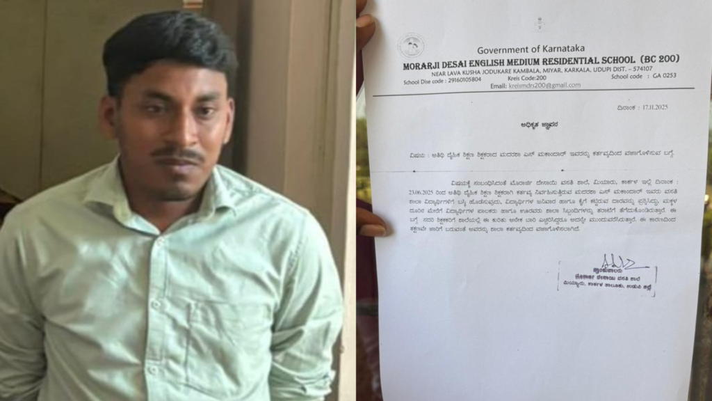 ಉಡುಪಿ: ಕಾರ್ಕಳ ತಾಲೂಕು ಮೀಯಾರು ಮೊರಾರ್ಜಿ ದೇಸಾಯಿ ಇಂಗ್ಲಿಷ್ ಮೀಡಿಯಂ ವಸತಿ ಶಾಲೆಯಲ್ಲಿ ವಿದ್ಯಾರ್ಥಿಗಳಿಗೆ ದೈಹಿಕ ಶಿಕ್ಷೆ ನೀಡಿದ ಆರೋಪದಡಿ ಅತಿಥಿ ದೈಹಿಕ ಶಿಕ್ಷಣ ಶಿಕ್ಷಕ ಮದರಸ್ ಮಕಾಂದಾರ್ ಅವರನ್ನು ಕರ್ತವ್ಯದಿಂದ ವಜಾಗೊಳಿಸಲಾಗಿದೆ. ಕಲಬುರ್ಗಿ ಮೂಲದ ಶಿಕ್ಷಕ ಮದರಸ್ ಮಕಾಂದಾರ್ ವಜಾಗೊಂಡಿರುವವರು.