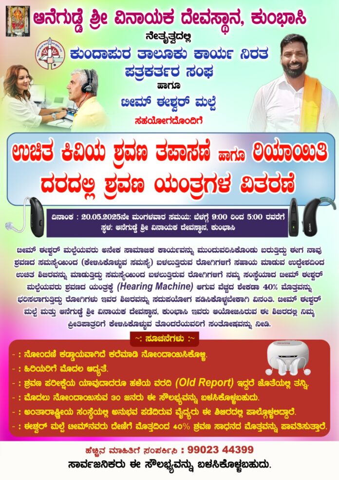 ಕುಂದಾಪುರ: ಆನೆಗುಡ್ಡೆ ಶ್ರೀ ವಿನಾಯಕ ದೇವಸ್ಥಾನ ಕುಂಭಾಸಿ, ಕುಂದಾಪುರ ತಾಲೂಕು ಕಾರ್ಯನಿರತ ಪತ್ರಕರ್ತರ ಸಂಘ ಹಾಗೂ ಟೀಮ್ ಈಶ್ವರ ಮಲ್ಪೆ ಇವರ ಸಹಯೋಗದೊಂದಿಗೆ ಮೇ.20ರಂದು ಕುಂಭಾಸಿ ಆನೆಗುಡ್ಡೆ ಶ್ರೀ ವಿನಾಯಕ ದೇವಸ್ಥಾನದ ವಠಾರದಲ್ಲಿ ಉಚಿತ ಕಿವಿಯ ಶ್ರವಣ ತಪಾಸಣೆ ಹಾಗೂ ರಿಯಾಯಿತಿ ದರದಲ್ಲಿ ಶ್ರವಣ ಯಂತ್ರಗಳ ವಿತರಣಾ ಕಾರ್ಯಕ್ರಮ ಜರುಗಲಿದೆ.
