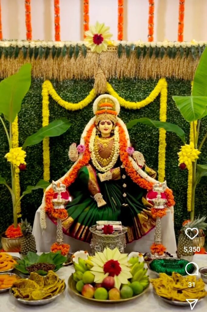 2. ಪೂಜಾ ವೇದಿಕೆ ಅಲಂಕಾರ – ಮೇಲೆ ಹೂವುಗಳಿಂದ ಅಲಂಕಾರ ಮಾಡಿ ಕಲಶ ಸ್ಥಾಪನೆ