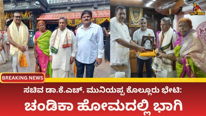 ಕೊಲ್ಲೂರು : ಇಂದು ಕೊಲ್ಲೂರು ಶ್ರೀ ಮೂಕಾಂಬಿಕಾ ದೇವಸ್ಥಾನಕ್ಕೆ ಕರ್ನಾಟಕ ಸರ್ಕಾರದ ಮಾನ್ಯ ಆಹಾರ, ನಾಗರಿಕ ಸರಬರಾಜು ಮತ್ತು ಗ್ರಾಹಕರ ವ್ಯವಹಾರಗಳ ಸಚಿವರಾದ ಡಾ. ಕೆ. ಎಚ್. ಮುನಿಯಪ್ಪ ಅವರು ಭೇಟಿ ದೇವಿಯ ದರ್ಶನ ಪಡೆದು ಚಂಡಿಕಾ ಹೋಮದಲ್ಲಿ ಭಾಗಿಯಾದರು.