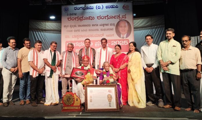 ಉಡುಪಿ  : ಎಂಜಿಎo ಕಾಲೇಜಿನ ಮುದ್ದಣ ಮಂಟಪದಲ್ಲಿ ರಂಗಭೂಮಿ ಉಡುಪಿ ವತಿಯಿಂದ ನಡೆಯುತ್ತಿರುವ ಮೂರು ದಿನಗಳ ರಂಗಭೂಮಿ ರಂಗೋತ್ಸವದ ಎರಡನೇ ದಿನ ಪ್ರಸಿದ್ಧ ವೈದ್ಯ ಡಾ. ಭಾಸ್ಕರಾನಂದ ಕುಮಾರ್ ಅವರು ನಾಡಿನ ಸಾಮಾಜಿಕ, ವೈದ್ಯಕೀಯ, ಧಾರ್ಮಿಕ, ಶೈಕ್ಷಣಿಕ ಹಾಗೂ ಸಾಂಸ್ಕೃತಿಕ ಕ್ಷೇತ್ರಕ್ಕೆ ನೀಡಿರುವ ಅನನ್ಯ ಕೊಡುಗೆಗಾಗಿ ‘೨೦೨೫ ನೇ ಸಾಲಿನ ರಂಗಭೂಮಿ ಪ್ರಶಸ್ತಿ ‘ ನೀಡಿ ಗೌರವಿಸಲಾಯಿತು.