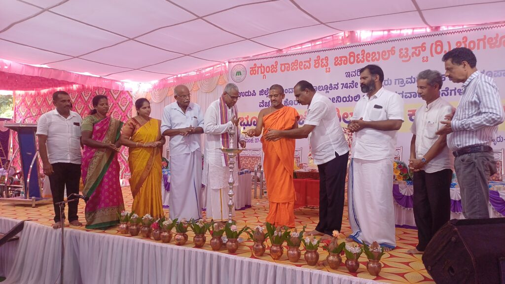 ಅವರು ಸೋಮವಾರದಂದು ಹೆಗ್ಗುಂಜೆ ರಾಜೀವ ಶೆಟ್ಟಿ ಚಾರಿಟೇಬಲ್ ಟ್ರಸ್ಟ್(ರಿ.) ಬೆಂಗಳೂರು ಇವರಿಂದ ಜಿಲ್ಲೆಯ ಕುಂದಾಪುರ ತಾಲೂಕಿನ 74 ನೇ ಉಳ್ಳೂರು ಗ್ರಾಮದಲ್ಲಿ ₹ 2.50 ವೆಚ್ಚದಲ್ಲಿ ಕೊರಗರ ಕಾಲೋನಿಯಲ್ಲಿ 14 ಮನೆಗಳ ಭೂಮಿ ಪೂಜೆ ಮತ್ತು ಶಿಲಾನ್ಯಾಸವನ್ನು ನೆರವೇರಿಸಿ, ಆರ್ಶೀವಚನ ನೀಡಿ, ಸಮಾಜದಲ್ಲಿ ನಾವೆಲ್ಲರೂ ನೆಲದಂತೆ ಬದುಕದೇ, ನೀರಿನಂತೆ ಬದುಕಬೇಕು. ದೇವರ ಕೊಟ್ಟ ಸಂಪತ್ತು ಸಮಾದ ಏಳಿಗೆಗೆ ಹಂಚಬೇಕು. ಅದು ಎಲ್ಲೆಡೆ ಹಬ್ಬಿ, ಇತರರಿಗೂ ಸ್ಫೂರ್ತಿ ಆಗಬೇಕು. ಹೆಚ್.ಎಸ್.ಶೆಟ್ಟಿಯವರ ಕಾರ್ಯವು ಅನೇಕರಿಗೆ ಪ್ರೇರಣೆಯಾಗಿರುವುದು ಶುಭ ಸೂಚನೆ ಎಂದರು. ಟ್ರಸ್ಟ್ನ ಅಧ್ಯಕ್ಷ ಡಾ.ಹೆಚ್.ಎಸ್.ಶೆಟ್ಟಿ ಪ್ರಾಸ್ತಾವಿಕ ಮಾತನಾಡಿ, ಉತ್ತಮ ಉದ್ದೇಶವನ್ನು ಹೊಂದಿದ ಮನಸ್ಸು ಮಾಡುವ ಕಾರ್ಯಗಳು ಯಶಸ್ವಿಯಾಗುತ್ತದೆ. ಇಂತಹ ವ್ಯಕ್ತಿಗಳು ಮಾಡುವ ಕೆಲಸಕ್ಕೆ ಶ್ರೀಗಳ ಆರ್ಶೀವಾದ ಮತ್ತು ಸಮಾಜದ ಬೆಂಬಲ ದೊರಕುತ್ತದೆ ಎಂದರು. ಒಳ್ಳೆಯ ಕೆಲಸಗಳು ಮಾಡುವಾಗ ಟೀಕೆ ಮತ್ತು ಪ್ರಶಂಸೆ ಸಾಮಾನ್ಯ. ನಾನು ಬಿಜೆಪಿಯವನೆಂಬ ಆರೋಪ ಇದೆ. ಆದರೆ ನಾನು ಬಿಜೆಪಿ ಅಲ್ಲ, ಅದರ ಸದಸ್ಯನೂ ಅಲ್ಲ. ಜನರು ಆಯ್ಕೆ ಮಾಡಿದ ಪ್ರತಿನಿಧಿಗಳಲ್ಲಿ ಹೆಚ್ಚಿನವರು ಬಿಜೆಪಿಯವರೇ ಇದ್ದಾರೆ. ಹೀಗಾಗಿ ಕಾರ್ಯಕ್ರಮದಲ್ಲಿ ಆ ಪಕ್ಷದವರು ಹೆಚ್ಚಿರುತ್ತಾರೆ. ನಾನು ಹಿಂದುತ್ವವಾದಿ. ಹಾಂಗಂದ ಮಾತ್ರಕ್ಕೆ ಇತರ ಮತಗಳ ದ್ವೇಷಿಯಲ್ಲ. ಜಾತಿ ಮತ ಭೇದವನ್ನು ಮರೆತು ಎಲ್ಲಾ ವರ್ಗಕ್ಕೂ ಸಹಾಯ ಮಾಡಿದ್ದೇವೆ ಎಂದವರು ತಿಳಿಸಿದರು.