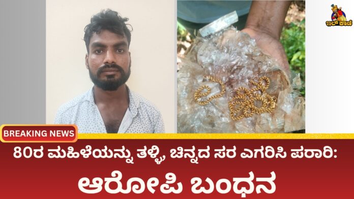 ಕಾರ್ಕಳದ ಮುಳ್ಕಾಡು ಎಳ್ಳಾರೆ ಗ್ರಾಮದ ಕುಮುದಾ ಶೆಟ್ಟಿ ಅವರು ಮನೆಯ ಮುಂಭಾಗದಲ್ಲಿ ಕುಳಿತಿದ್ದಾಗ, ಅಪರಿಚಿತ ವ್ಯಕ್ತಿಯೋರ್ವ ಬಂದು ತಾನು ಕಾರ್ಕಳದ ಸೂಪರ್ ವೈಸರ್ ಎಂದು ಹೇಳಿ ಇಲ್ಲಿ ಹತ್ತಿರ ಮನೆ ಉಂಟಾ, ನಿಮ್ಮ ಮನೆಯಲ್ಲಿ ಸಿಸಿ ಕ್ಯಾಮರಾ ಉಂಟಾ ಎಂದು ವಿಚಾರಿಸಿದ್ದಾನೆ. ಸ್ವಲ್ಪ ಹೊತ್ತಿನ ಬಳಿಕ ಏಕಾಏಕಿ ಕುಮುದಾ ಅವರ ಕುತ್ತಿಗೆಗೆ ಕೈಹಾಕಿ ನೆಲಕ್ಕೆ ದೂಡಿ 25 ಗ್ರಾಂ ತೂಕದ ಚಿನ್ನದ ಸರ ಎಗರಿಸಿ ಪರಾರಿಯಾಗಿದ್ದಾನೆ. ಆರೋಪಿ ತಳ್ಳಿದ ರಭಸಕ್ಕೆ ಕುಮುದಾ ಅವರು ಗಂಭೀರವಾಗಿ ಗಾಯಗೊಂಡಿದ್ದು, ಉಡುಪಿಯಲ್ಲಿ ಚಿಕಿತ್ಸೆ ಪಡೆಯುತ್ತಿದ್ದಾರೆ.